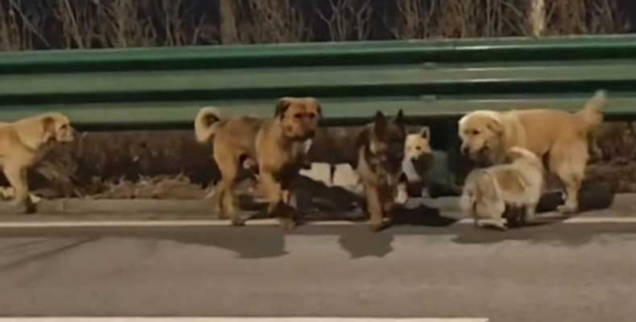 නමුත් සෙසු සුනඛයින් තම තුවාල ලැබූ මිතුරා තනි කර දමා ගියේ නැත. උන් සියල්ලන්ම එම ජර්මන් ෂෙපර්ඩ් සුනඛයා වටකර ගනිමින්, අධිවේගී මාර්ගයේ වාහනවලින් ආරක්ෂා කරමින්, උගේ වේගයට අනුව ගමන් කරන අයුරු අතිශය සංවේදීය.
